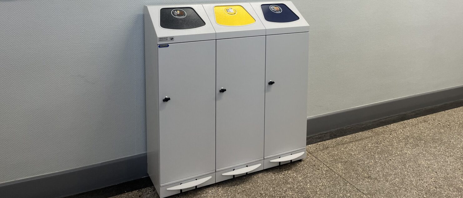 Die kleinen Mülleimer sind aus den Klassenzimmern ganz verschwunden, die Mülleimer mit Fußbedienung im Flur, laden nun zum richtigen Trennen ein.