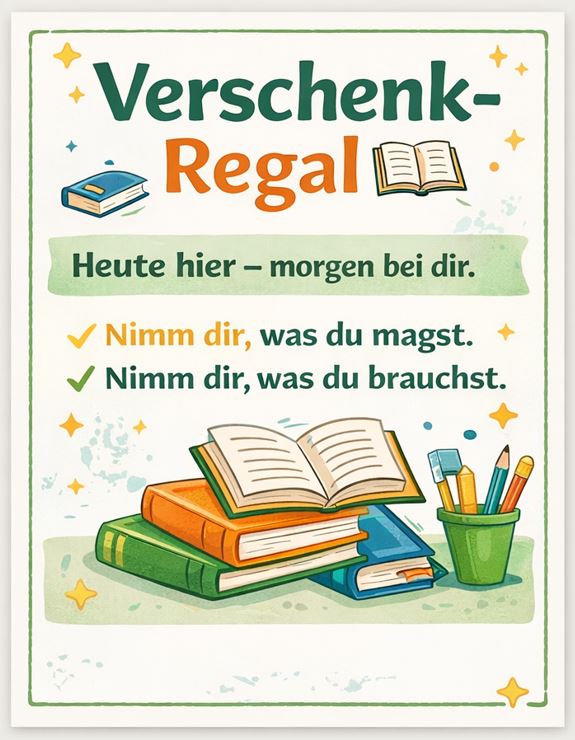 Gegenüber von der Cafeteria findet sich ein Tauschregal für Bücher und Büromaterialien.
